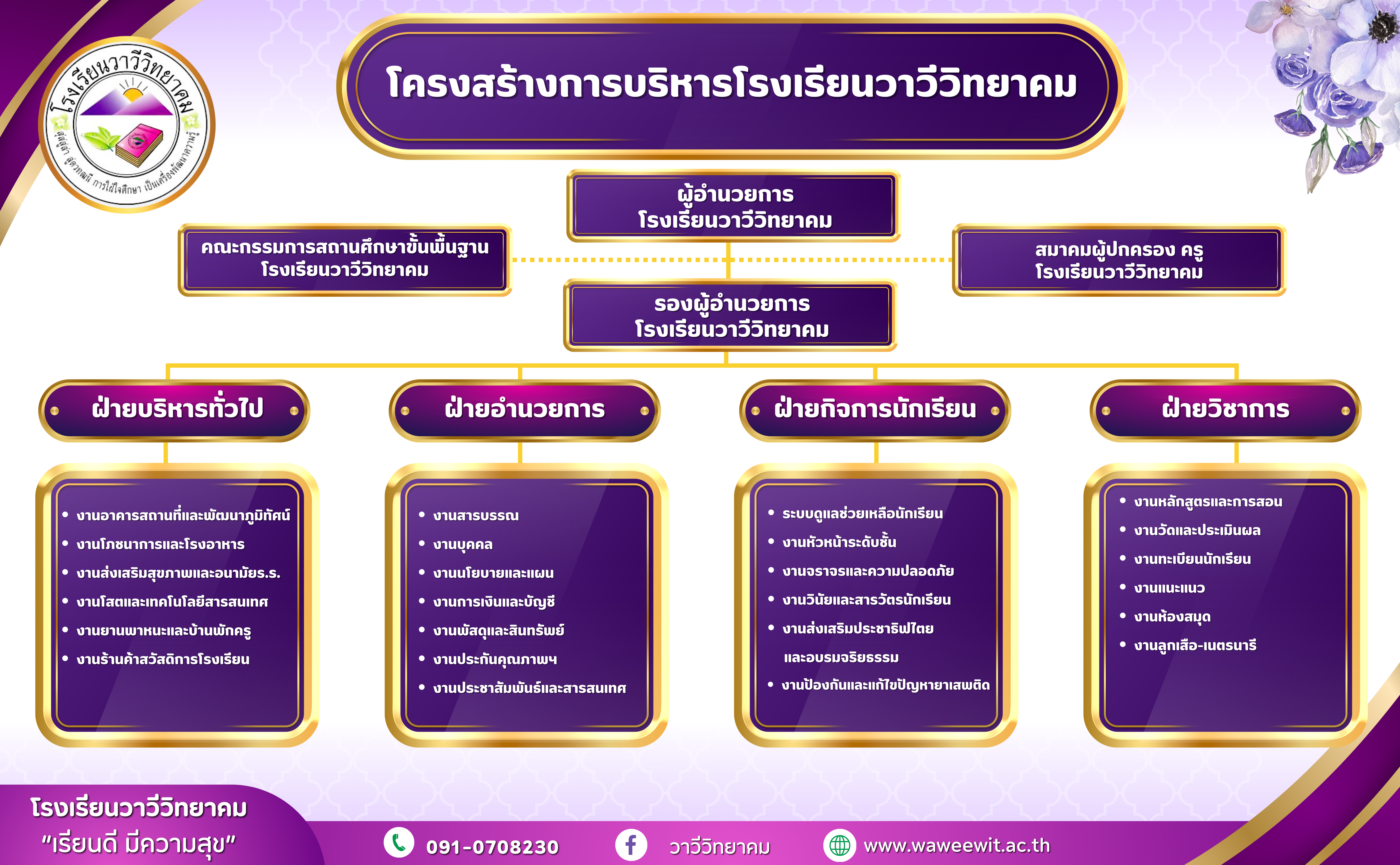 โครงสร้างหน่วยงานและอำนาจหน้าที่ ประเมิน 2567 30 Jul 2024 867 share tweet share แผนผัง ประกาศDownload 1 กฎหมายที่เกี่ยวข้องกับการบริหารของสถานศึกษาขั้นพื้นฐานDownload 2 บทบาทหน้าที่ของสถานศึกษาตามเจตนารมณ์ของ พระราชบัญญัติการศึกษาแห่งชาติDownload 03 อำนาจหน้าที่วาวีวิทยาคมDownload 3 บทบาทหน้าที่ของผู้อำนวยการสถานศึกษาขั้นพื้นฐานDownload